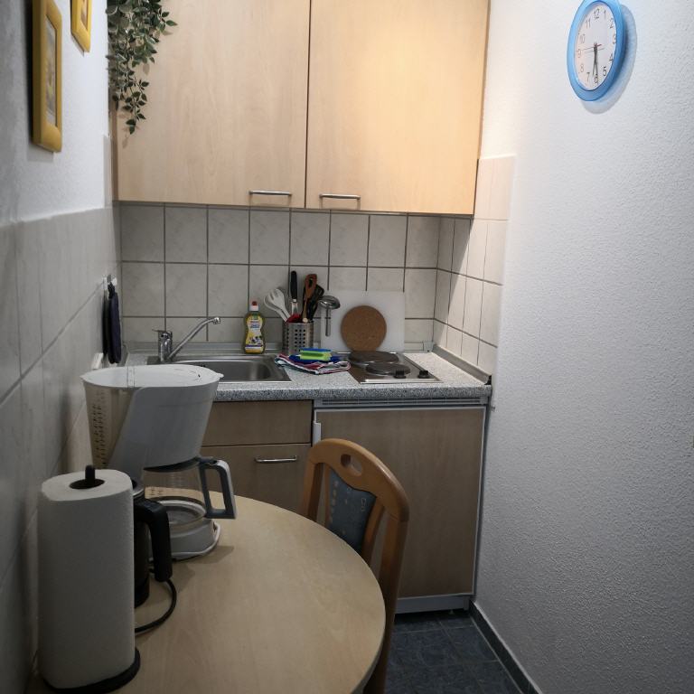 Pantryküche mit 2-Plattenherd, Kaffeemaschine, Kühlschrank, Toaster, Wasserkocher, sämtliches Geschirr.