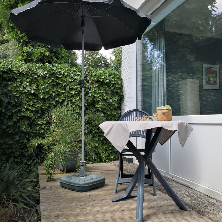 Terrasse oder Balkon mit Sitzgelegenheiten und Tisch, Wäscheständer und Sonnenschirm.